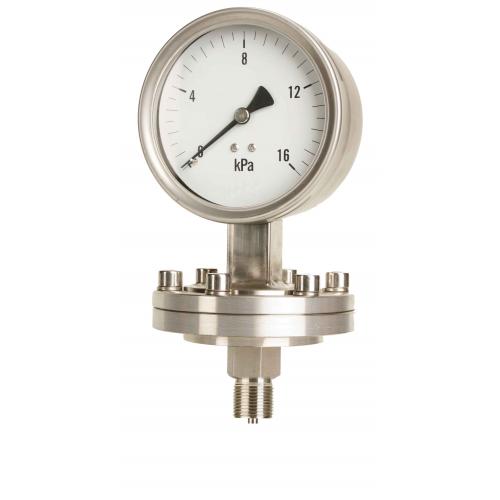 螺纹连接隔膜压力表有螺纹连接式隔离器与一个通用型压力仪表组成一个整体的隔膜表。当测量介质的压力P作用于隔膜,则隔膜产生变形,压缩压力仪表测压系统的密封液,使其形成P-△P的压力。当隔膜的刚性足够小时,则△P也很小,压力仪表测压系统形成的压力就近于测量介质的压力。