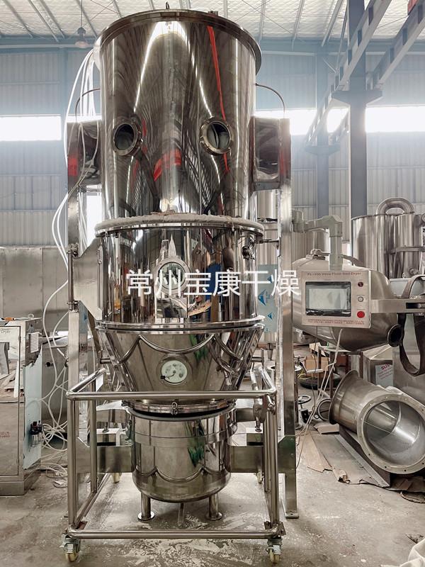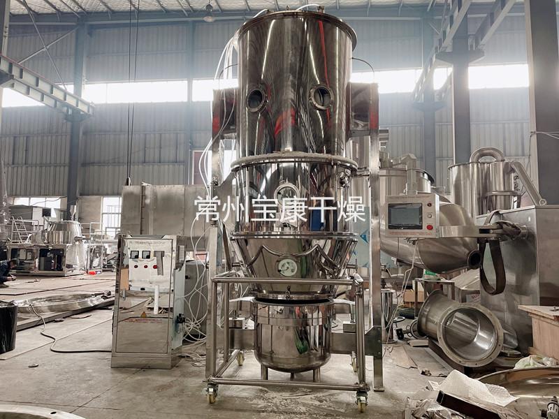 胶囊颗粒流化床制粒干燥机是利用空气经热交换器加热后,形成热风经阀板分配进入主机,湿物料从加料器进入干燥机,由于风压的作用,物料在干燥机内形成沸腾状态,并与热空气进行广泛接触,从而在较短时间完成物料烘干。
