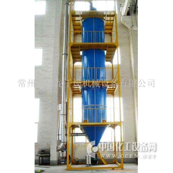 本机组工作过程为料液通过隔膜泵高压输入,喷出雾状液滴,然后同热空气并流下降,大部分粉粒由塔底排料口收集,废气及其微小粉末经旋风分离器分离,废气由抽风机排出,粉末由设在旋风分离器下端的授粉筒收集,风机出口还可装备二级除尘装置,回收率在96-98%以上。