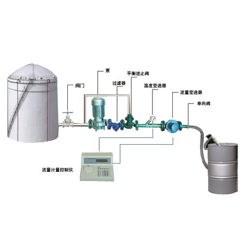 液体定量装桶设备采用质量计量方式。系统由定量计量控制仪和管道流量变送器温度传感器等组成。在液体输送过程中,适时采集流量信号和温度变化信号。控制仪表在初始输入该液体20℃的标准密度,然后将流量信号和温度信号通过换算系数进行同步换算,以计算出液体的质量公斤数,在达到预置的定量发送数量时自动控制停泵关阀,精度达到0.2%的定量质量计量。仪表还可打印出此次发送液体的公斤数。