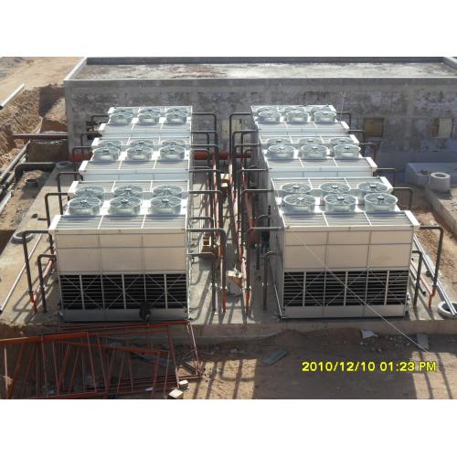 工作流体在蒸发式冷凝器的盘管中循环,流体的热量通过管壁传递,与水和空气形成饱和湿热蒸汽,热量由风机排入大气,水分则挡回水槽循环喷淋。 喷淋水在循环过程中通过PVC散热片降低水温,与新鲜入风形成风、水同向流动,盘管主要依靠显热和潜热热传导的方式。