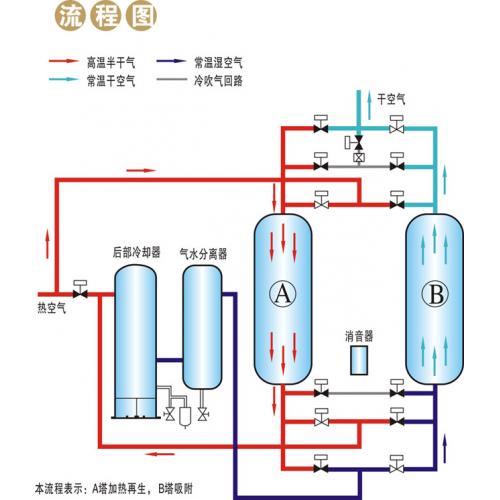 压缩空气余热再生吸附式干燥机(亦称压缩热再生干燥机),是利用空压机Ⅱ级排气的高温热能或未经冷却的高温压缩空气对吸附剂进行深层脱附再生,无需外加热源,加热时无再生气耗,工作可靠,露点稳定,是一种极具节能效果的新型压缩空气干燥机。