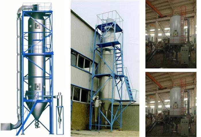 本机组工作过程为料液通过高压均质机高压输入,喷出雾状液滴,然后同热空气并流下降,大部分粉粒由塔底排料口收集,废气及其微小粉末经旋风分离器分离,废气由抽风机排出,粉末由设在旋风分离器下端的授粉筒收集,风机出口还可装备二级除尘装置,回收率在96-98%以上。