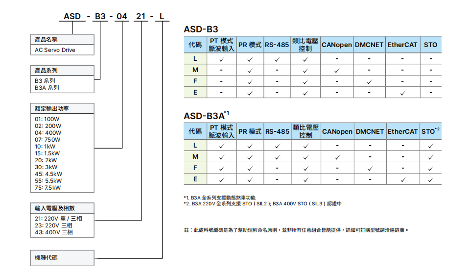 支持动态刹车台达B3A系列ASD-A3-1043-E脉冲+EtherCat协议,A3系列推出A3新产品,新增加了动态刹车和STO 安全防护机制支援 STO (Safe Torque Off) 功能,确保人员的安全性 符合标准 IEC/EN 61800-5-2认证 ASDA-B3A 220 V SIL2 Level