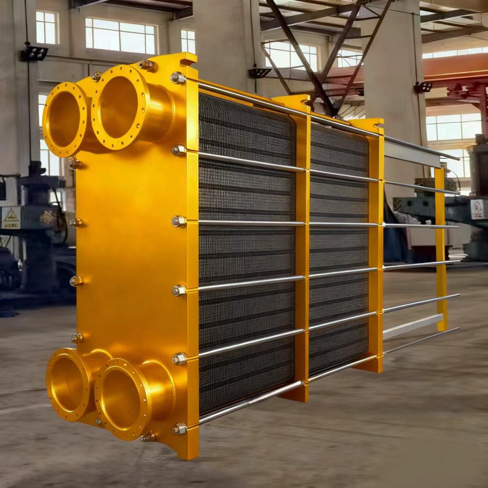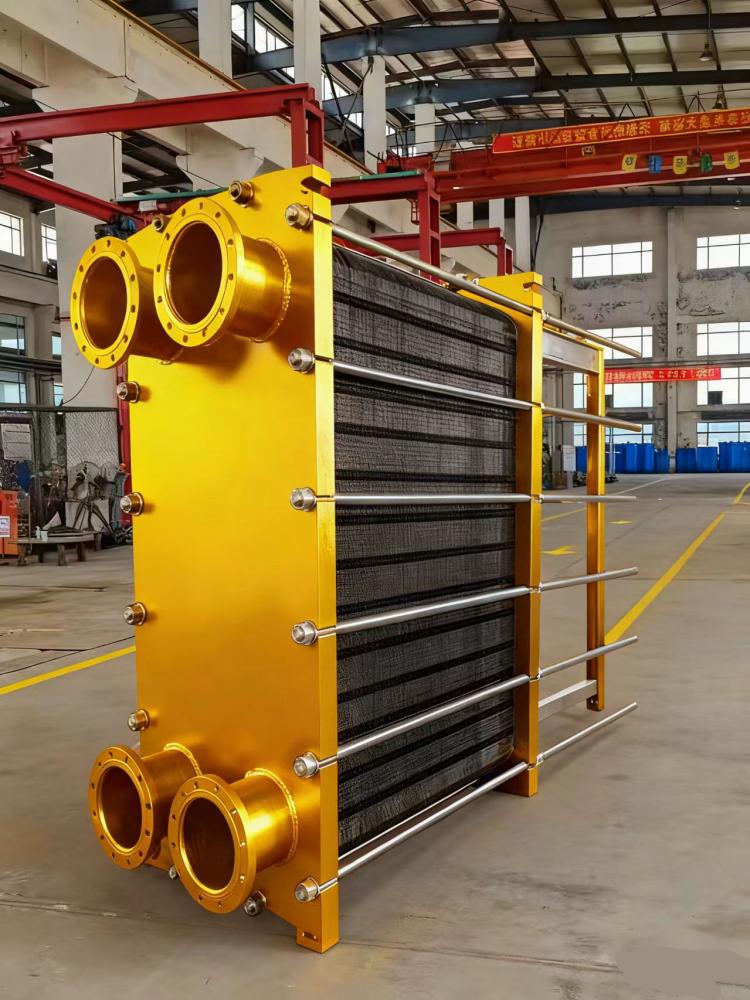 板式换热器是将板片以叠加的形式装在固定压紧板、活动压紧板中间,然后用夹紧螺栓夹紧而成。